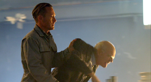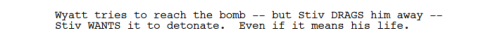 Now, for reasons we do not know, Stiv was single-mindedly dedicated to protecting the mission. As I mentioned at the very beginning, he tries to stop Wyatt and Kate from deactivating the bomb. Stiv knows the bomb doesn’t have much time left, but he fights with everything in him to make certain it goes off, even though he is right next to it. He is on the ship it will destroy. He is completely willing to sacrifice himself for for this. It’s true. Here’s that section from the Pilot script: