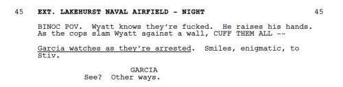 The part with the arrest went a little differently in the Pilot script. Although it really could have been the same, if omitted. But I’ll include it so I can comment.