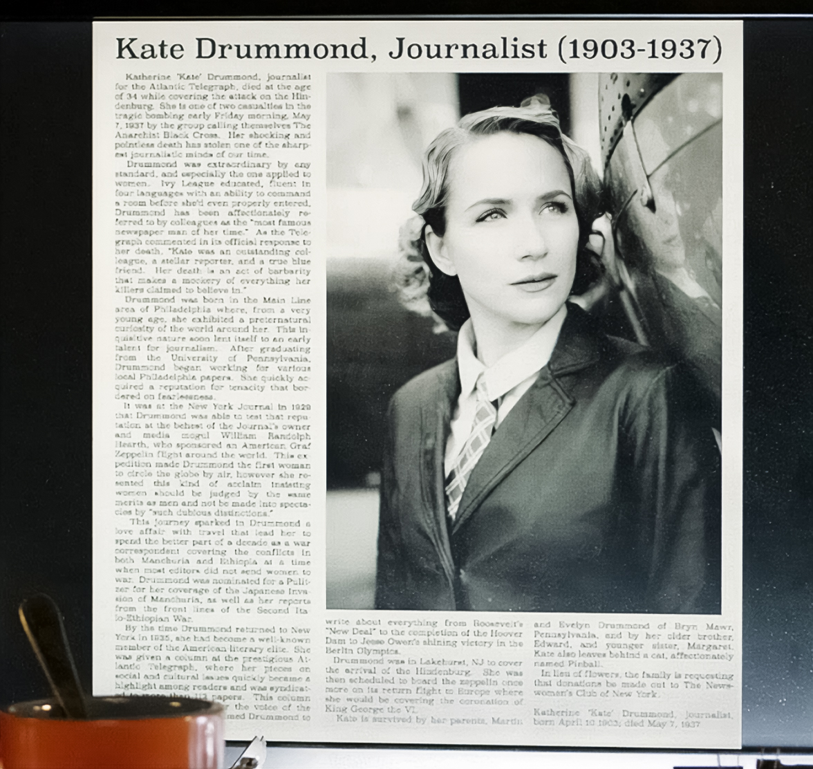 Katherine "Kate" Drummond, journalist for the Atlantic Telegraph, died at the age of 34 while covering the attack on the Hindenburg. She is one of two casualties in the tragic bombing early Friday morning, May 7, 1937 by the group calling themselves The Anarchist Black Cross. Her shocking and pointeless death has stolen one of the sharpest journalistic minds of our time.